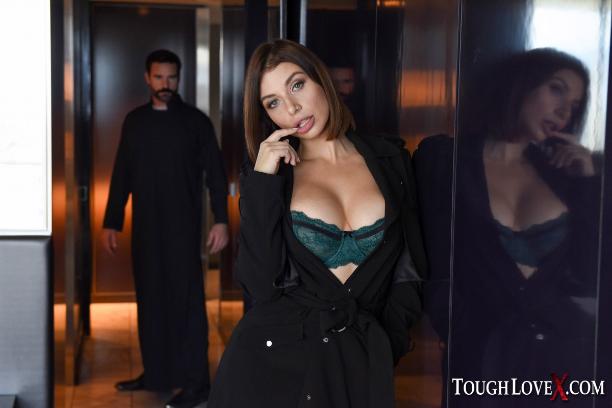 Брюнетка прикрывает свои голые сиськи перед священником