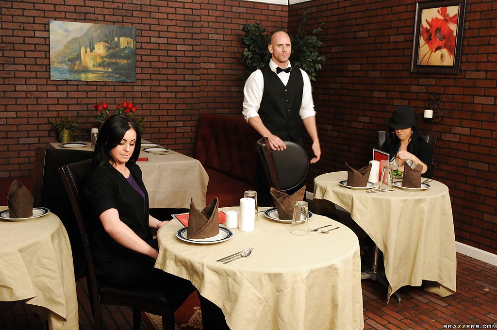 Две похотливые мамочки в джинсах соблазняют своего официанта и дразнят его член