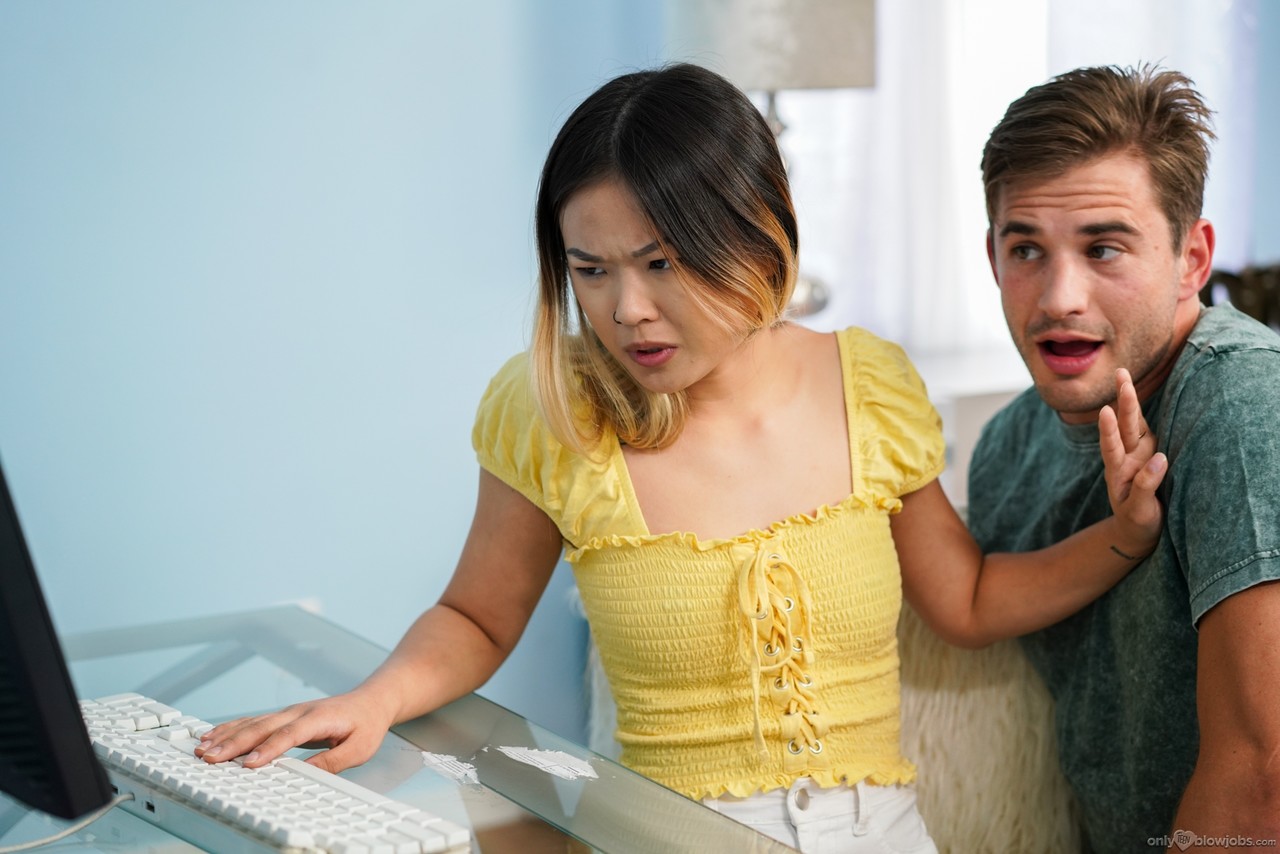 Миниатюрная азиатка лижет мошонку, отсасывая маленький член