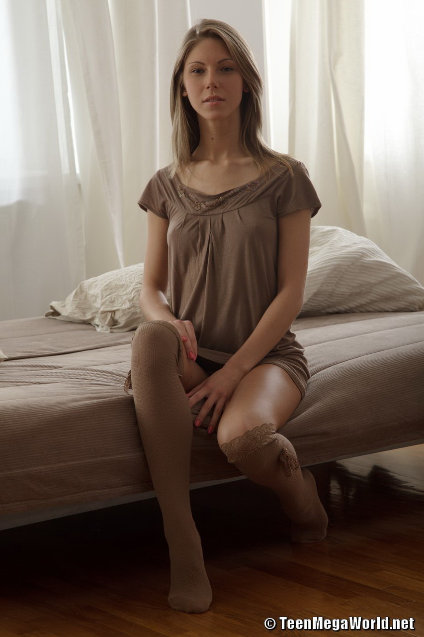 Миниатюрная молоденькая Анжелика привлекает внимание к своей идеально гладкой киске в обнаженном виде