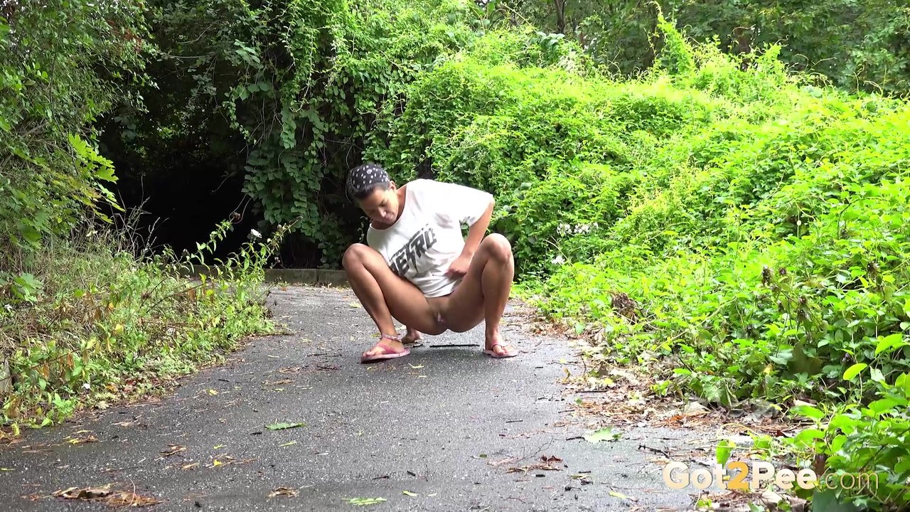 Одинокая женщина Хлоя Ламур мочится на мощеную дорожку в сандалиях